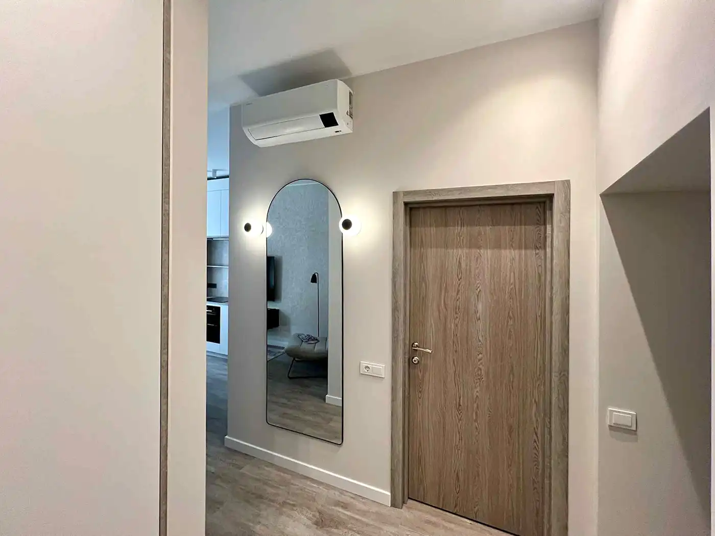 Vonios kambarys įrengtas visiškai nuo nulio – atlikti hidroizoliacijos darbai, suklijuotos plytelės, sumontuoti visi santechnikos prietaisai. Įrengtas ir kondicionierius, kurio trasa paslėpta konstrukcijose, o įranga vizualiai integruota į bendrą interjerą.
