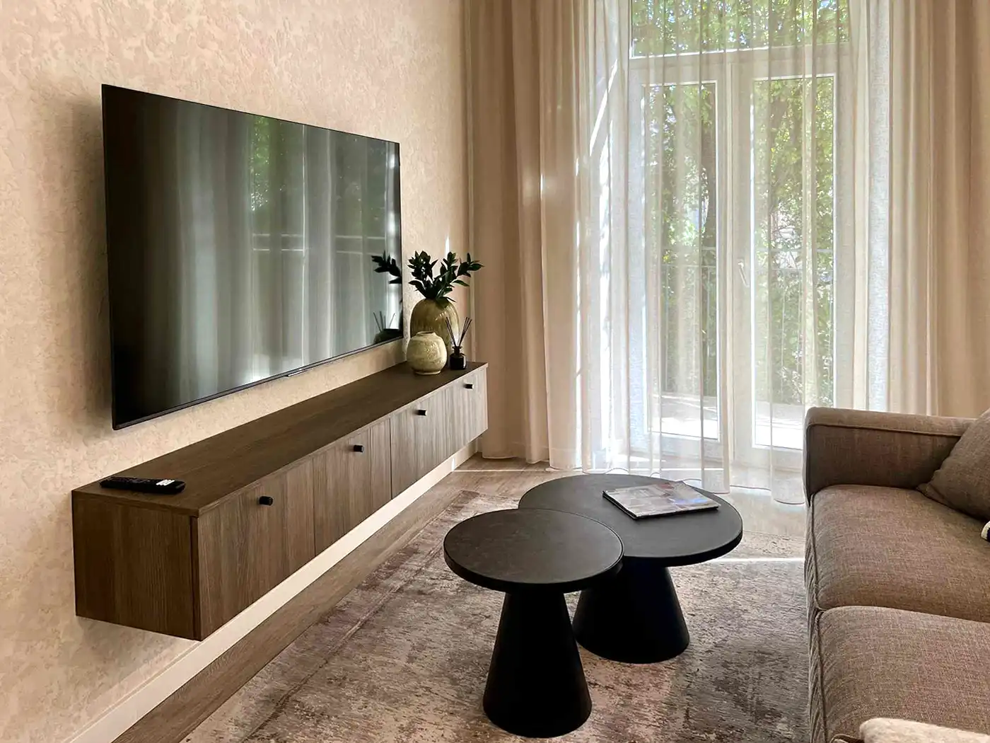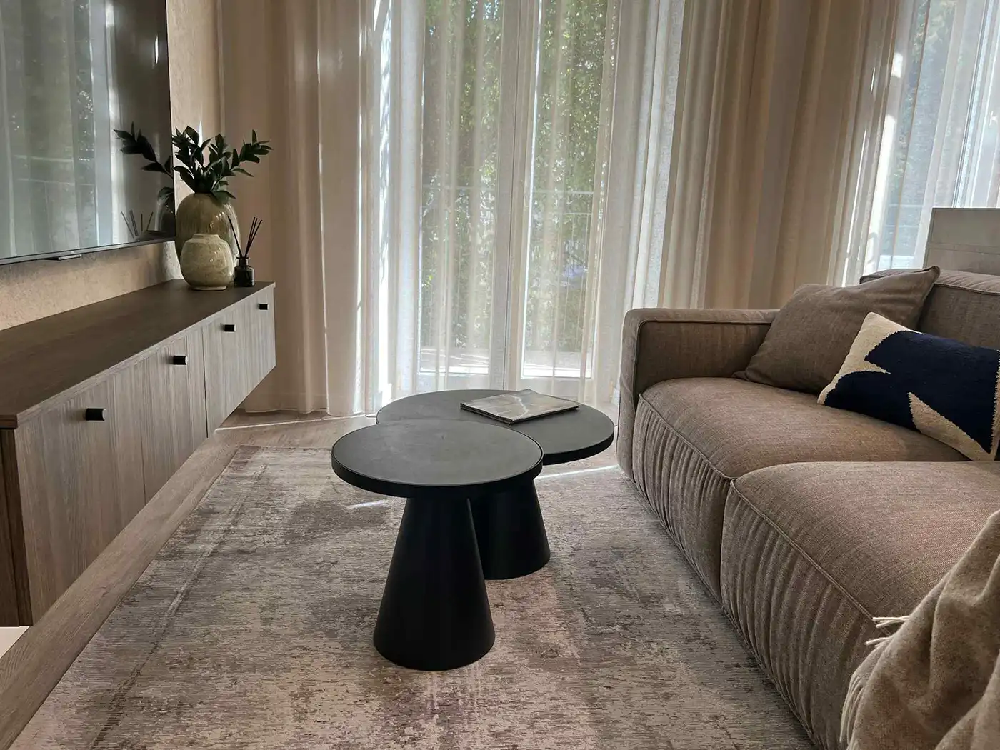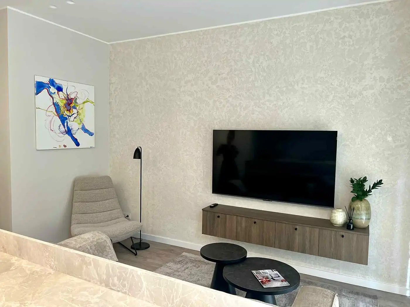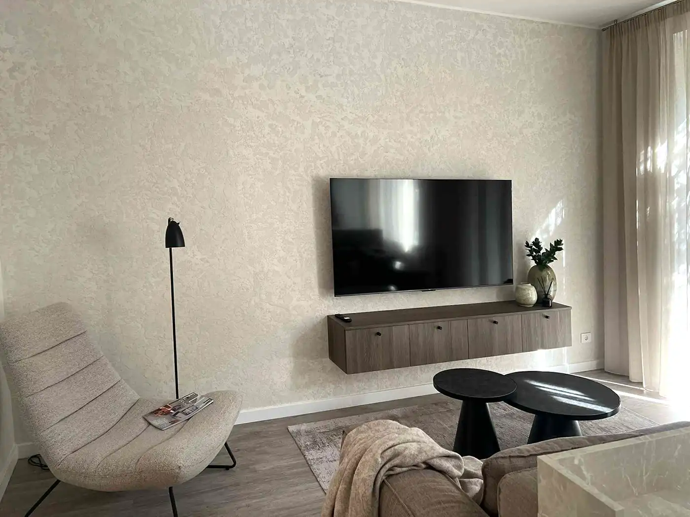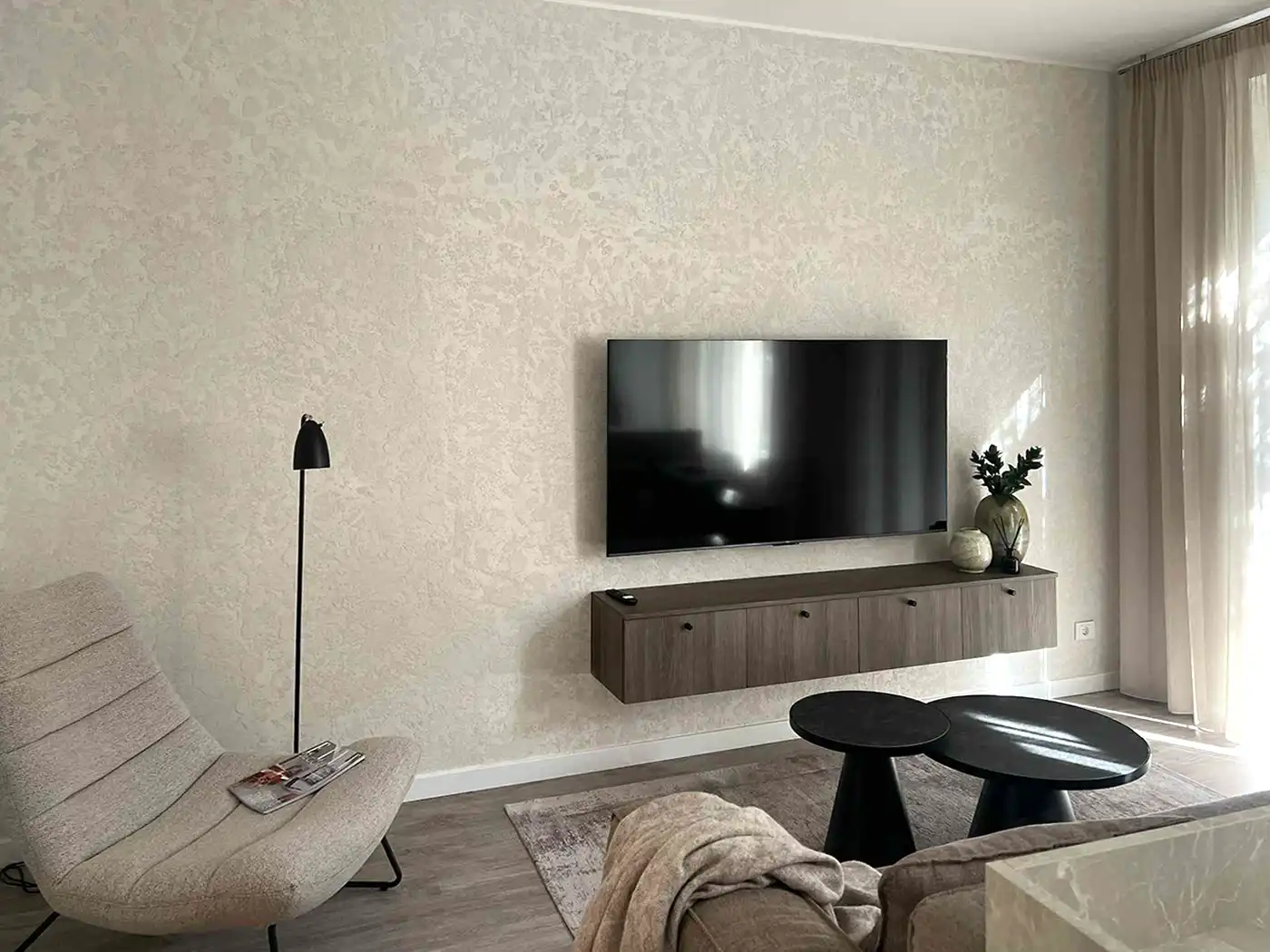 Svetainėje įrengėme pakabinamą TV lentyną, pagamintą iš natūralaus medžio imitacijos plokštės. Svetainėje panaudotos akcentinės detalės – du juodi svetainės staliukai su juodu pastatomu šviestuvu ir mėlynų atspalvių ryškus paveikslas subalansuoja erdvę, sukurdami kontrastą. Grindys dengtos laminuota danga, vizualiai primenančia natūralų medį.