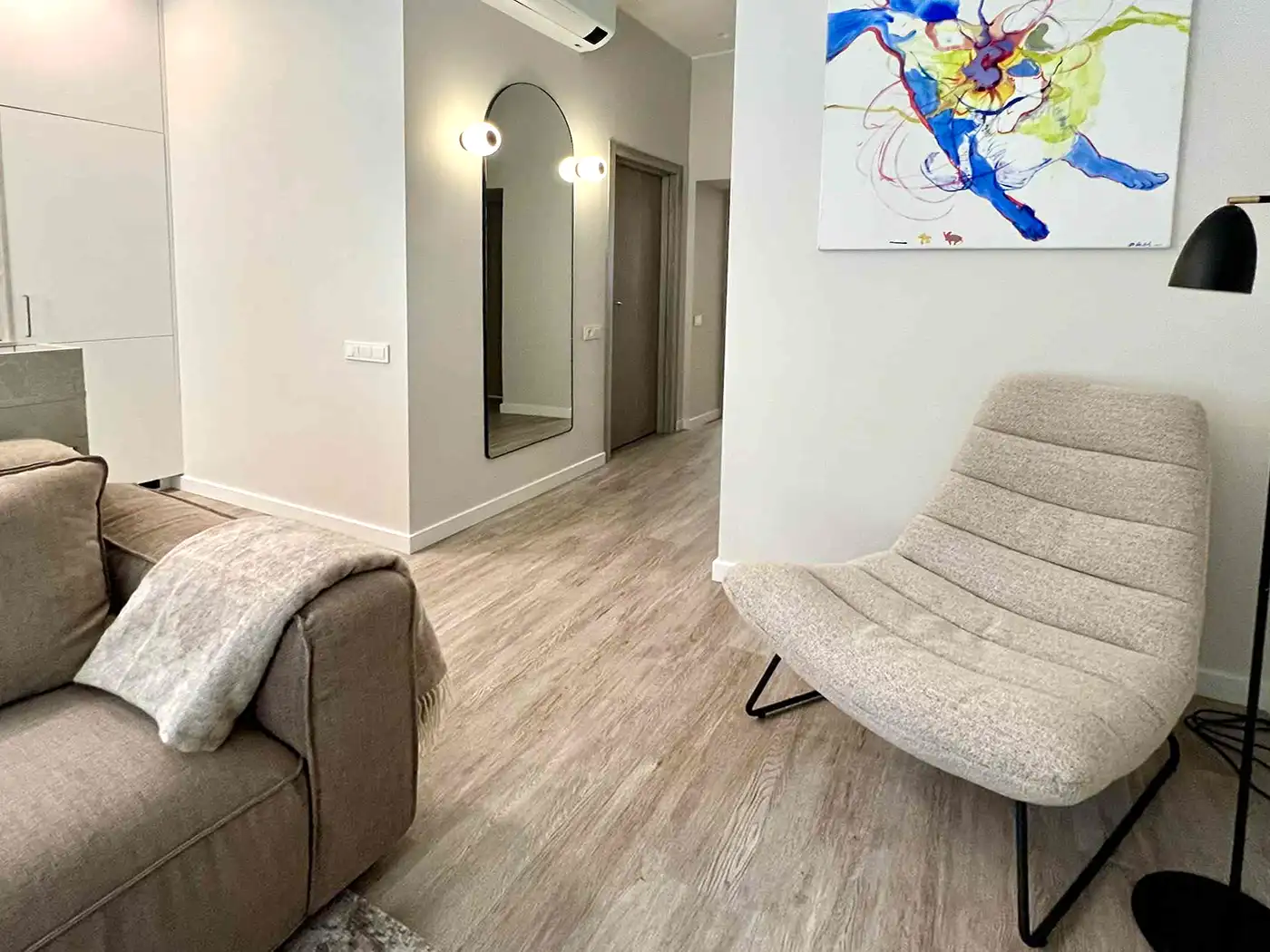 Buto dizainą sukūrė interjero dizainerė, kuri parengė projektą, pagal kurį ir įgyvendinti visi būsto remonto sprendimai. Pasirinktas stilius – modernus minimalizmas.