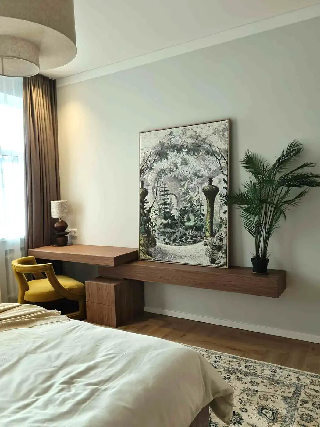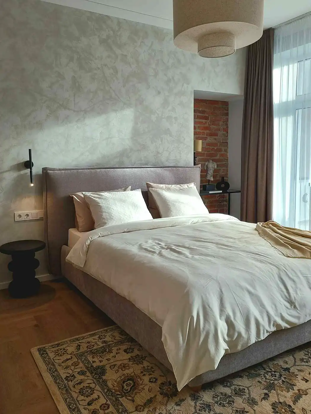 Miegamasis – šilta ir jauki erdvė, kurioje vyrauja neutralūs tonai. Čia viena siena dekoruota dekoratyviniu tinku ir įrengtas subtilus apšvietimas. Miegamajame parinktas klasikinių raštų kilimas ir integruotas minimalistinis rašomasis stalas, kuris suteikia papildomo funkcionalumo. Pagrindiniu akcentu tapo didelio formato paveikslas virš konsolės, kuriantis miegamajame išskirtinę atmosferą.