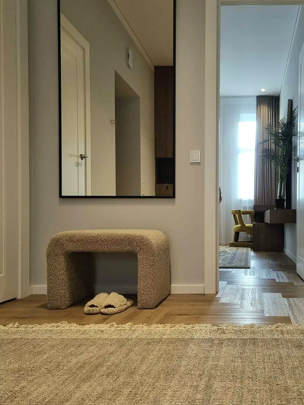 Kapitalinio remonto metu buvo atliktas pilnas buto atnaujinimas, apimantis visus pagrindinius vidaus apdailos ir įrengimo etapus. Pirmiausia butas buvo perplanuotas. Siekiant geriau išnaudoti turimą erdvę, pagal interjero dizainerės projektą iš naujo suformavome kambarius. Taip pat užtikrinome geresnį natūralios šviesos patekimą į patalpas. Perplanavimo rezultatas – erdvesnis ir šviesesnis būstas.