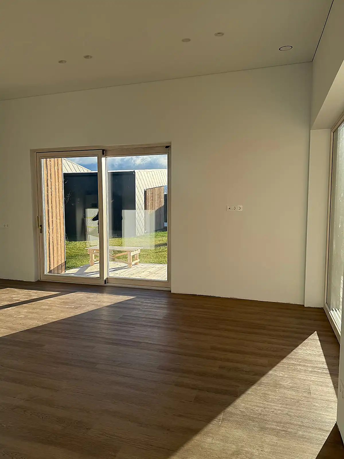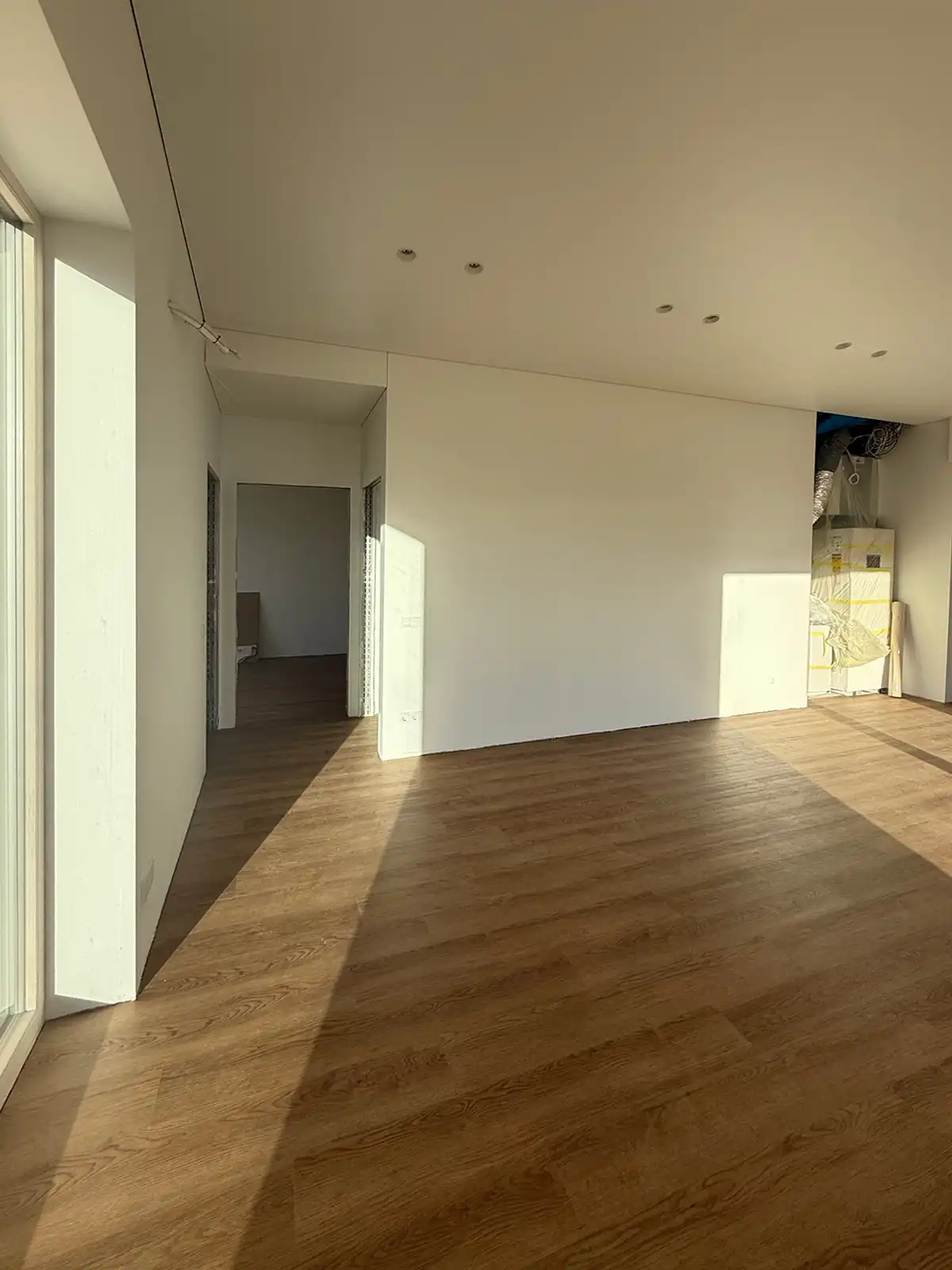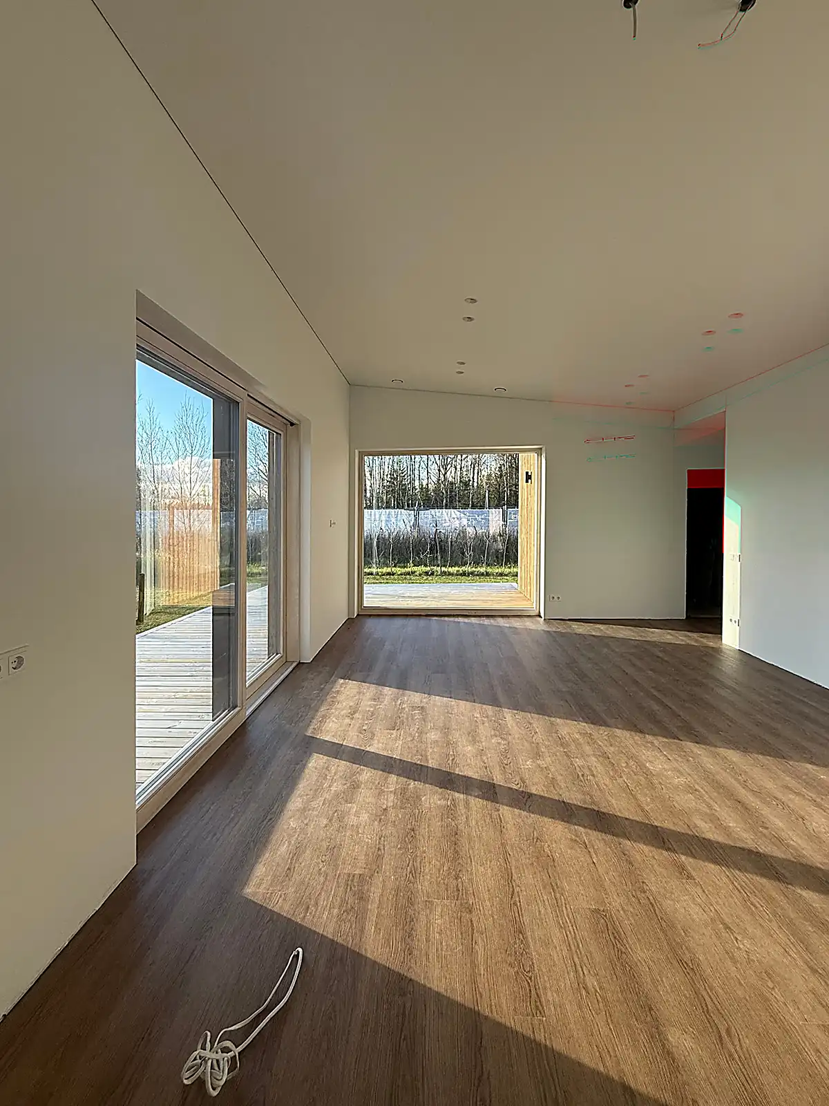 Svetainė ir virtuvės zona (kol kas be baldų) sudaro vieningą, atvirą erdvę. Parinktas šiltas grindų tonas kontrastuoja su baltomis sienomis ir lubomis, sukuriant subalansuotą minimalizmo pojūtį. Lubose ritmiškai išdėstėme įleidžiamus šviestuvus, kurie interjerui suteikia tvarkos ir modernumo.