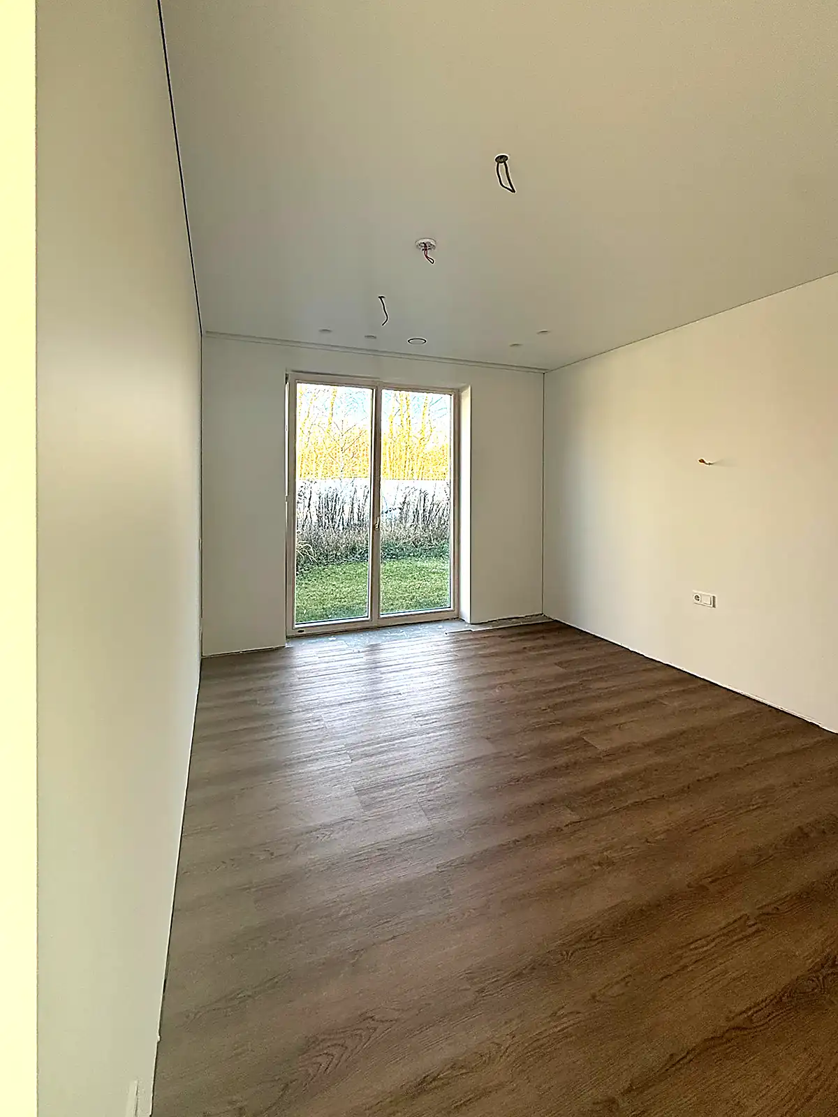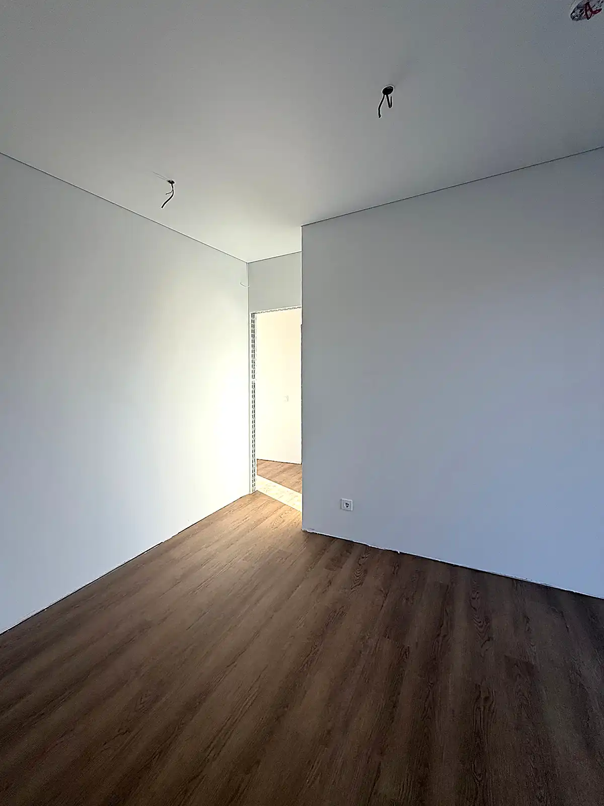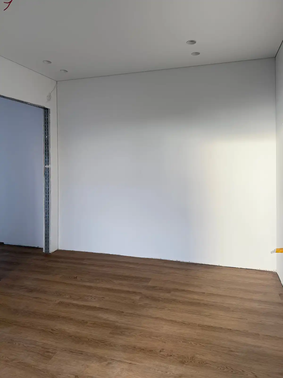Svetainė ir virtuvės zona (kol kas be baldų) sudaro vieningą, atvirą erdvę. Parinktas šiltas grindų tonas kontrastuoja su baltomis sienomis ir lubomis, sukuriant subalansuotą minimalizmo pojūtį. Lubose ritmiškai išdėstėme įleidžiamus šviestuvus, kurie interjerui suteikia tvarkos ir modernumo.