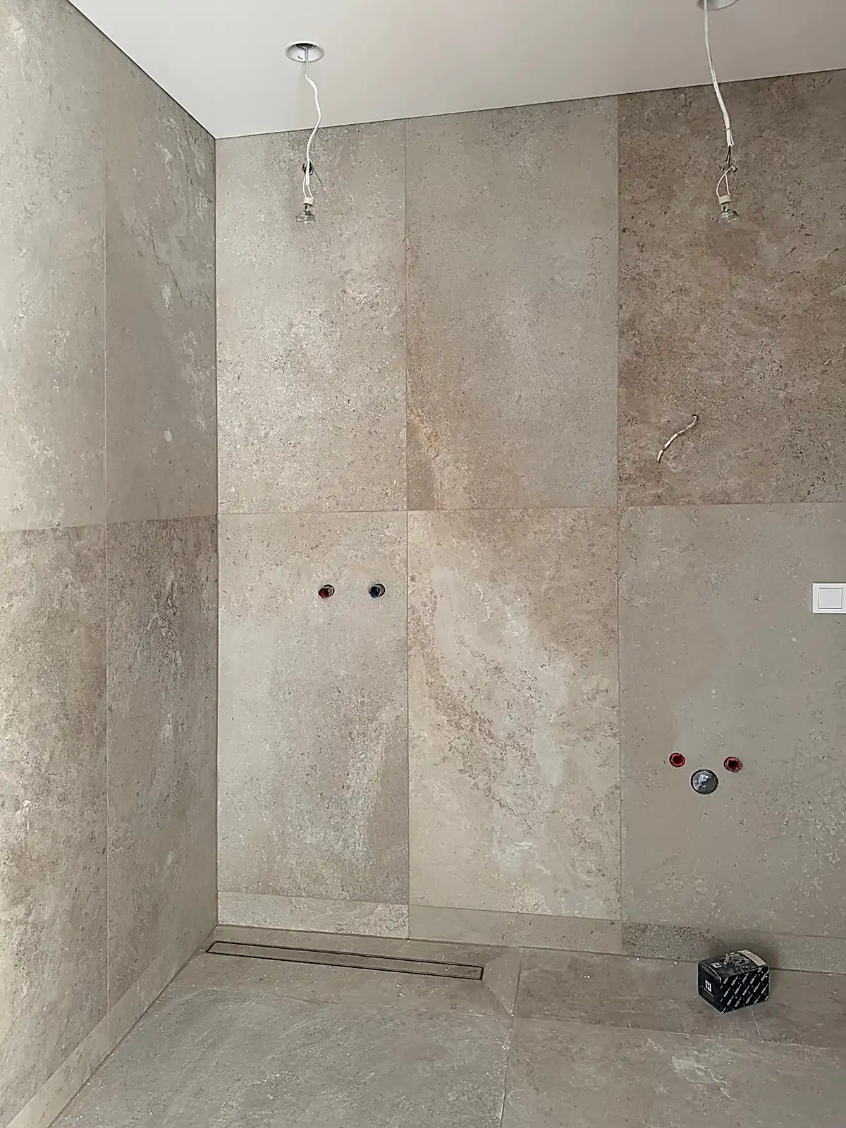 - Suklijuotos plytelės vonios kambariuose: vonios kambaryje sumontuotos didelio formato plytelės. Atliekant darbus tiksliai suformuotos plytelių siūlės, kampai ir nuolydžiai. Taip pat paruošėme visus mazgus santechnikos prietaisų montavimui;